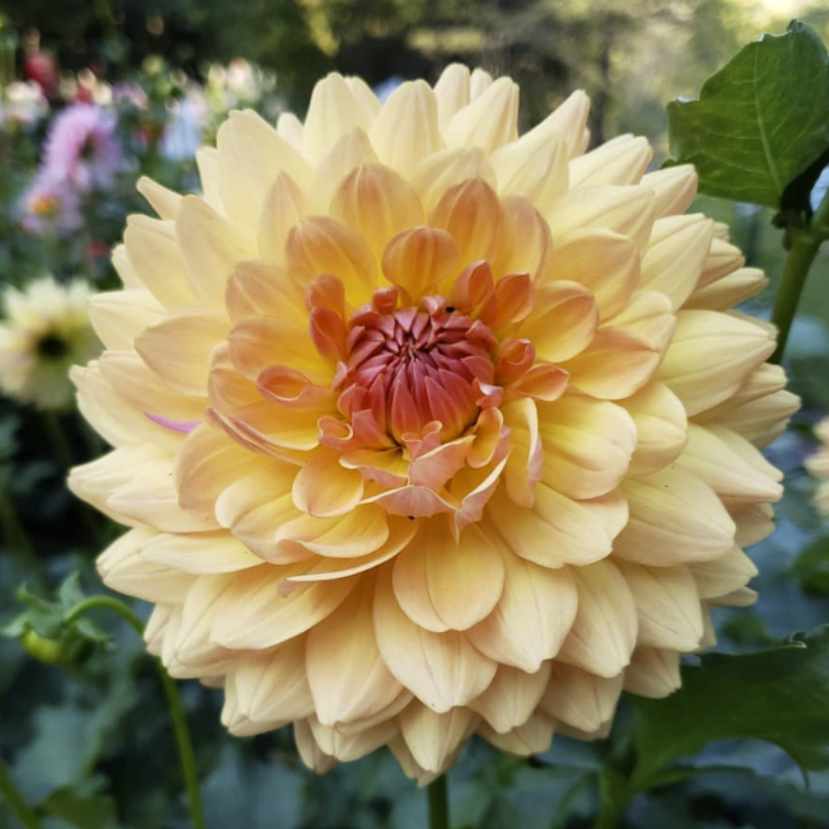 This dahlia features is a soft blend of apricot, peach, and yellow, with a subtle touch of lavender at the center.